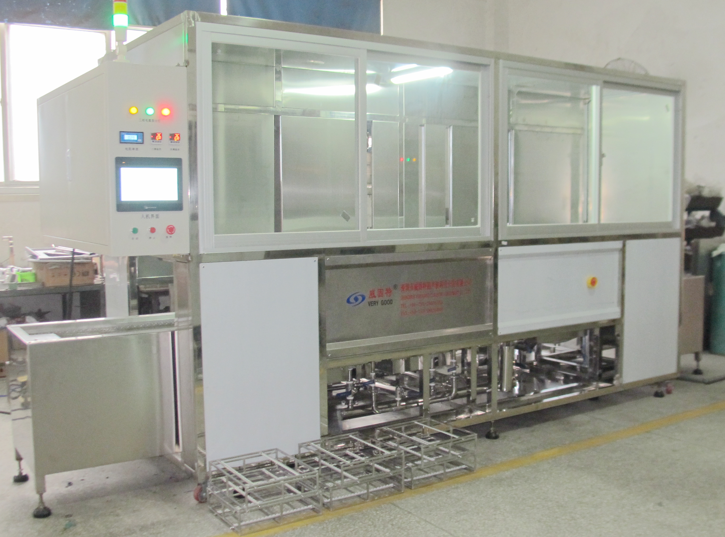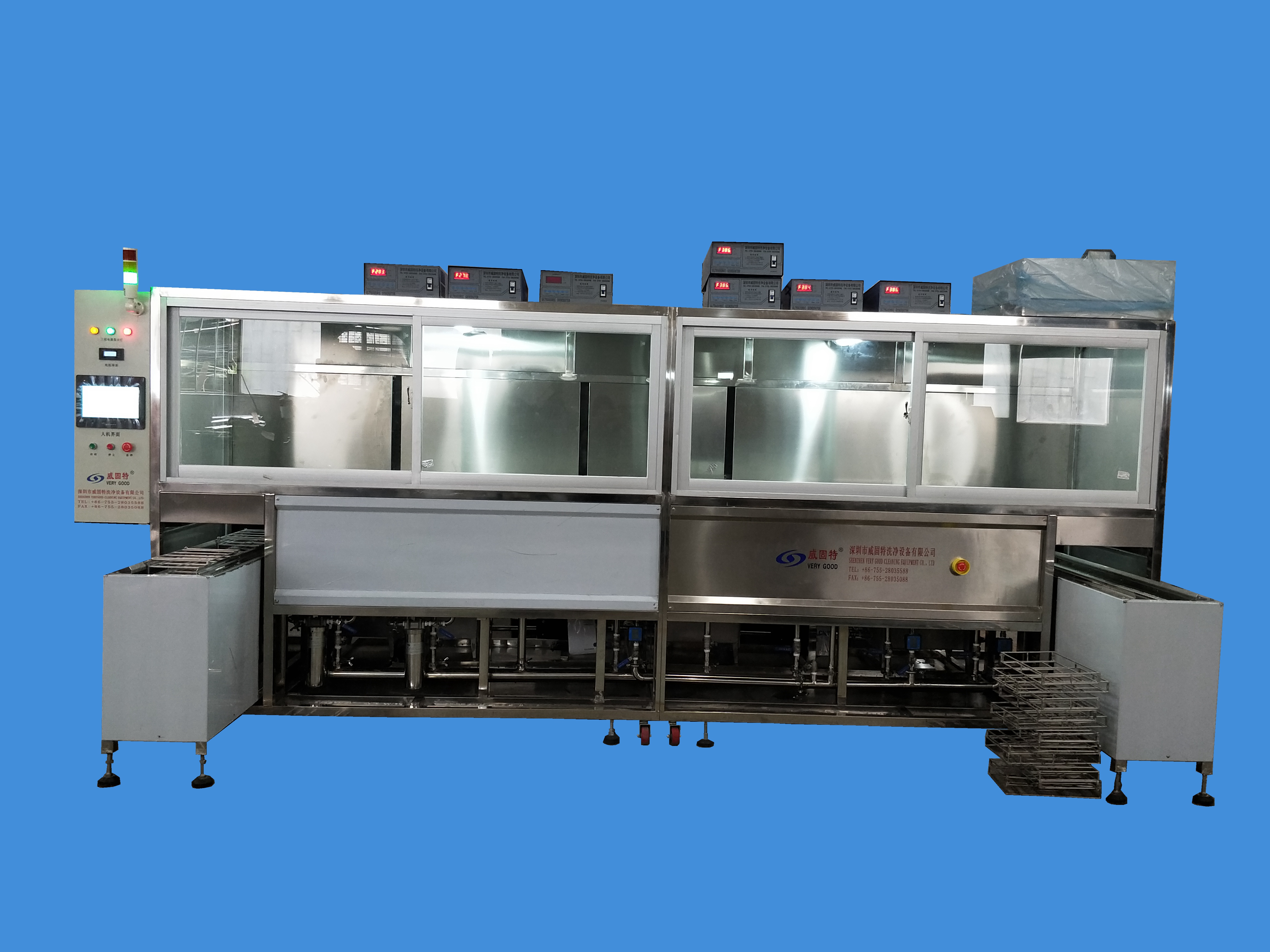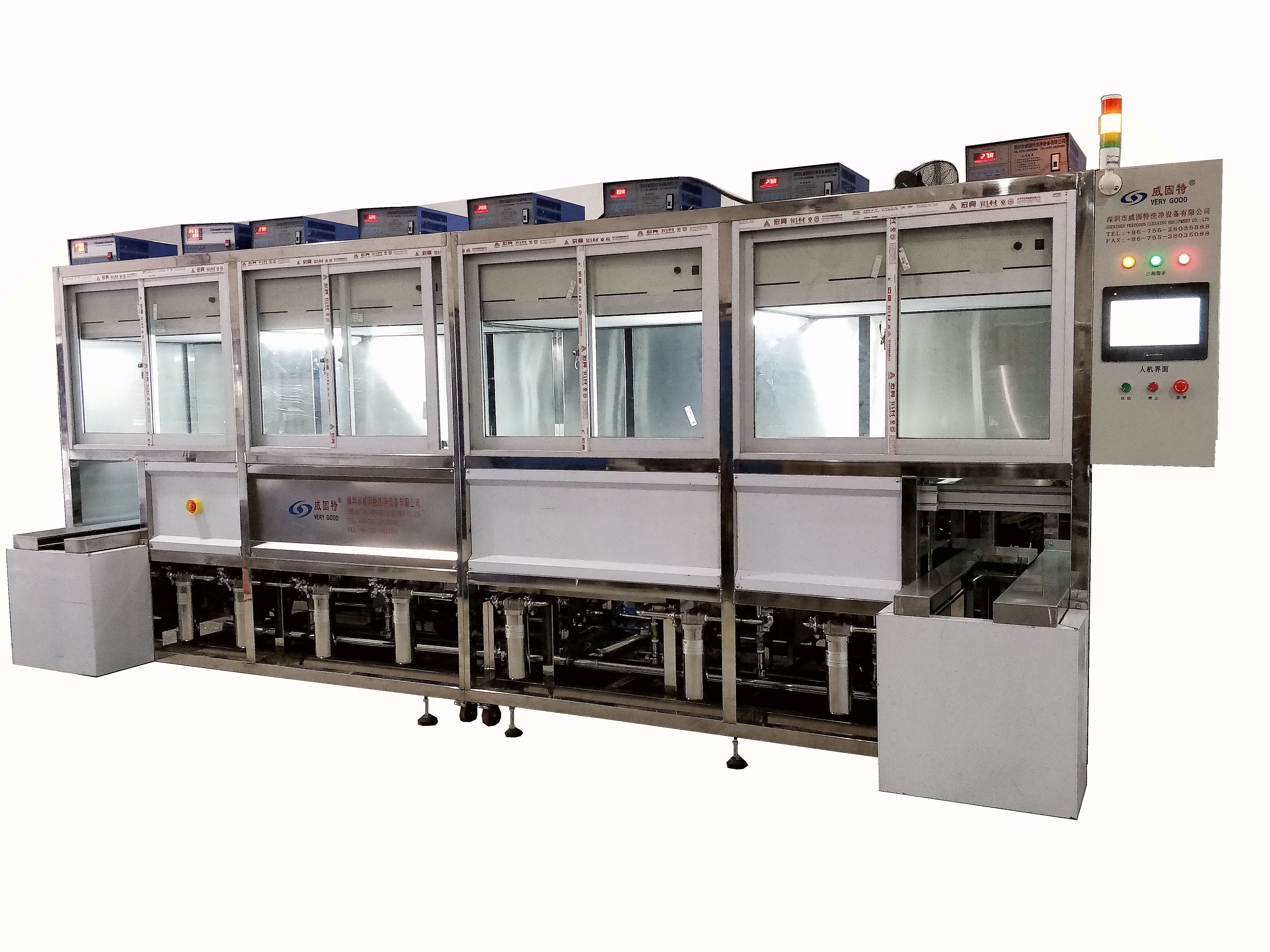 威固特全自動石英晶振監(jiān)控片深圳超聲波清洗機設備共有8個功能槽,配置有循環(huán)過濾系統(tǒng)、自動恒溫系統(tǒng)、觸摸屏系統(tǒng)、拋動系統(tǒng)、超聲波清洗系統(tǒng)、預熱箱系統(tǒng)、溢流系統(tǒng)、噴淋系統(tǒng)等。
